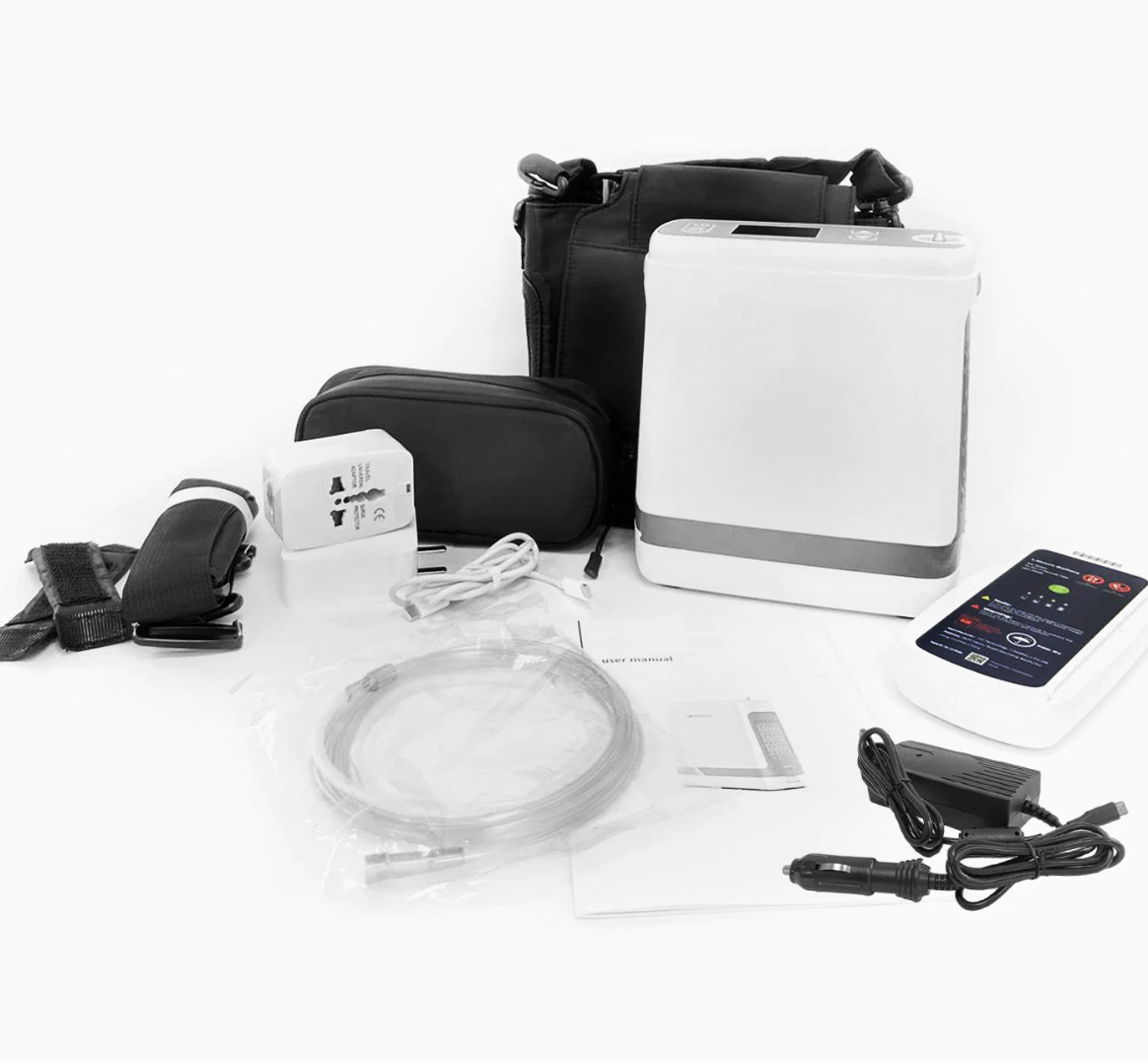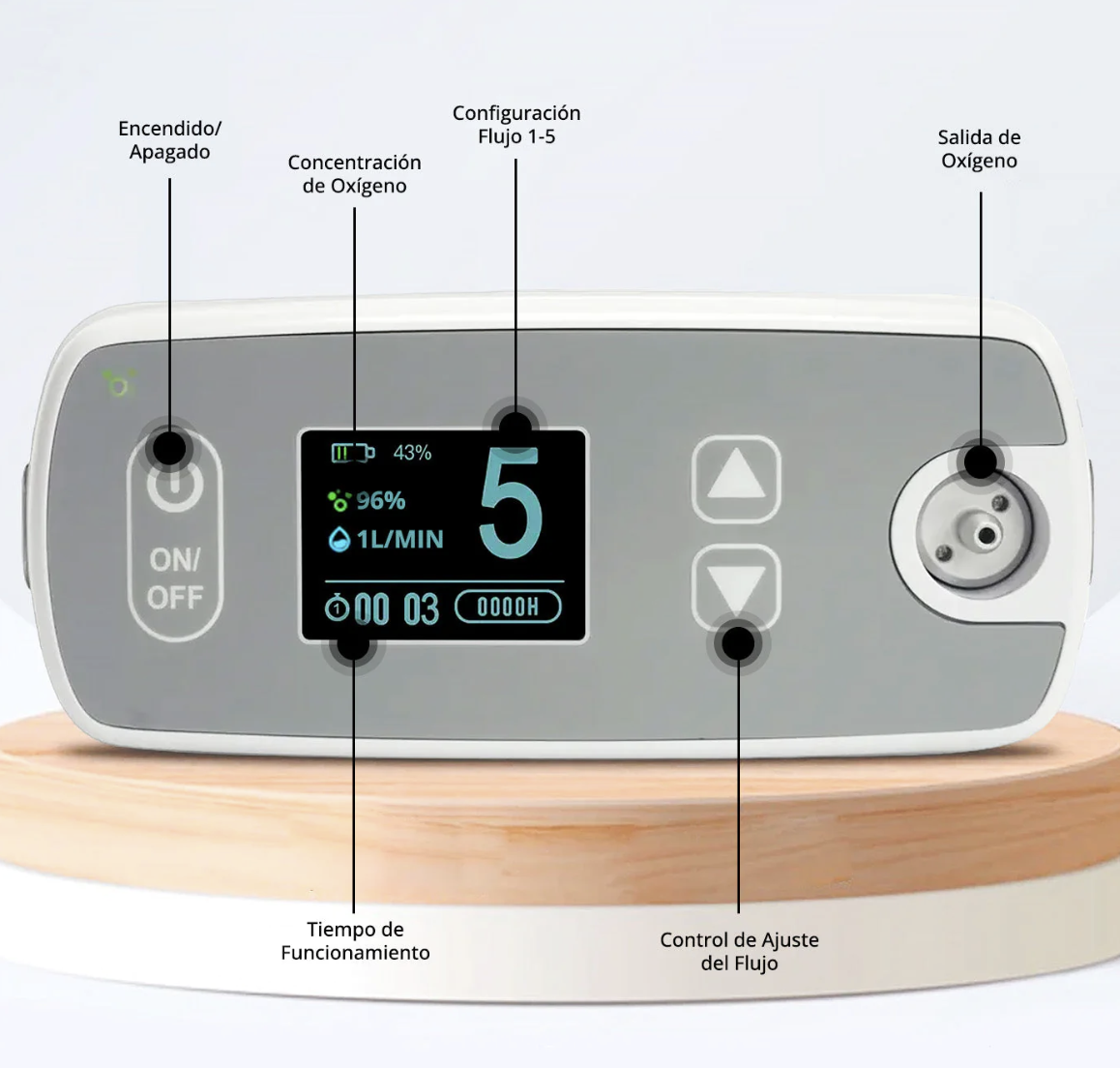 - Accesorios Incluidos: Bolso de transporte, cargador para vehículo y 2 cánulas nasales.