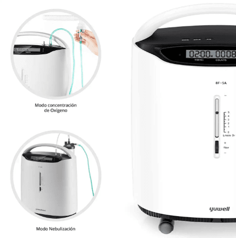 El Concentrador de Oxígeno Yuwell 8F-5AW ofrece un suministro constante de oxígeno y la versatilidad del nebulizador, diseñado para ofrecer una solución integral para tus necesidades respiratorias.